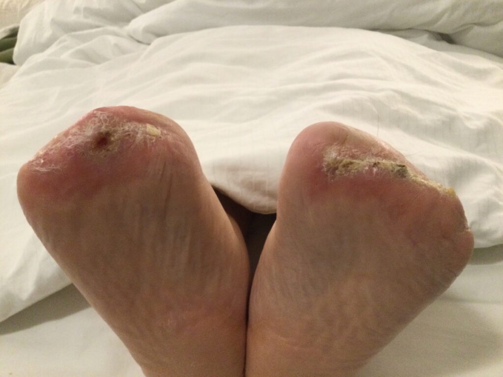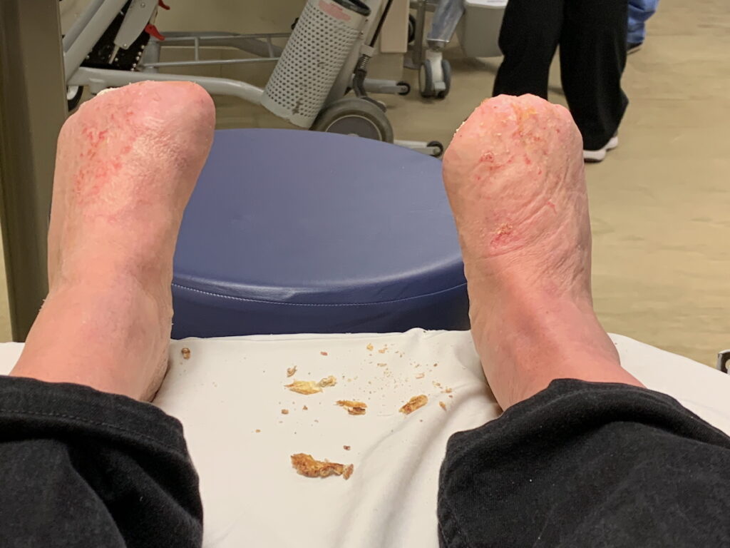 April 22, 2021 – Fast forward to 2021. For an extended period of time after my foot surgery, I would regularly visit with the orthopedic surgeon, and he would carve off dead skin, calluses, and scabbing from my healing feet. This is the least gruesome photo of my feet before they completely healed that I can share with you. The rest are quite disgusting.
