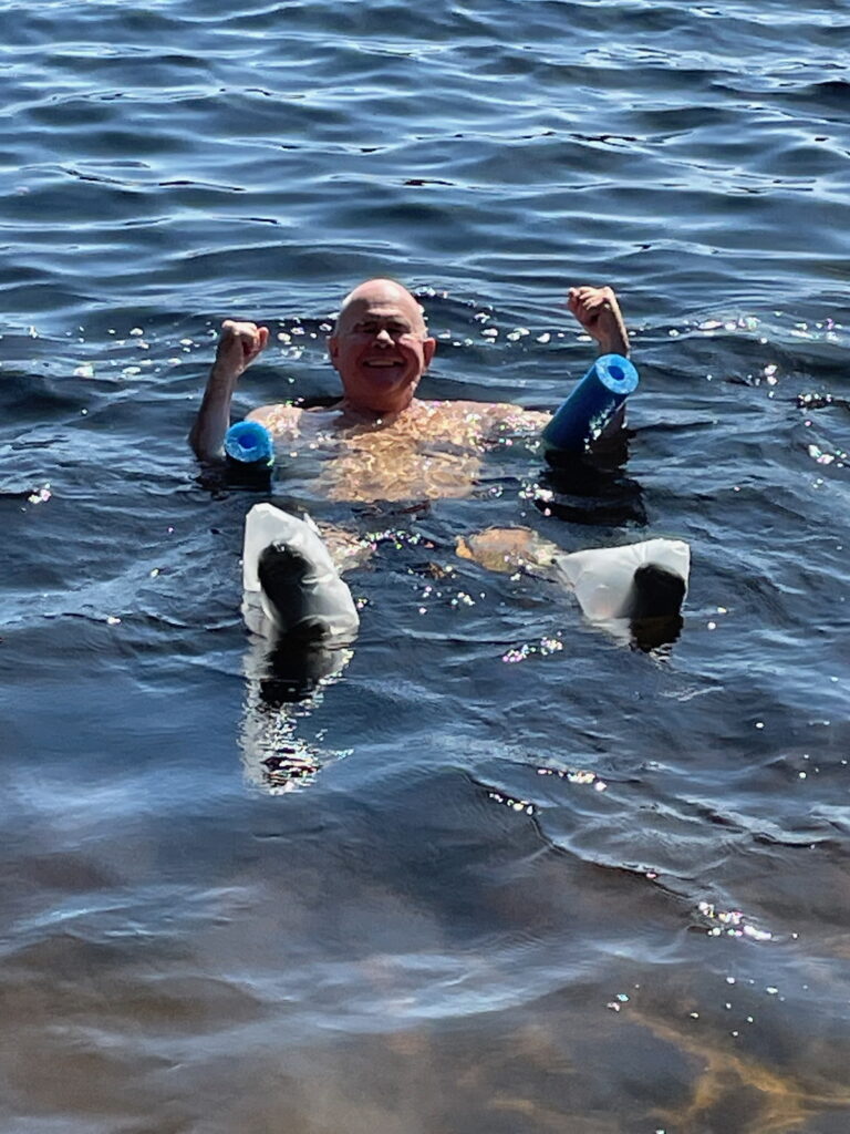 August 12, 2021 – I go swimming for the first time… With my special booties and my socks on, of course. 🙂