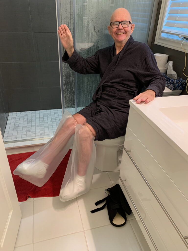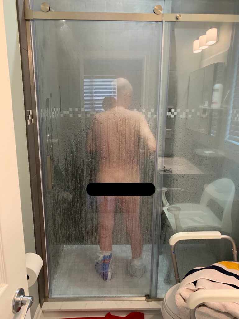 June 19, 2020 – I had my first shower since 2019. It was all sponge baths up to that point. Notice the milk bags strapped onto my feet to keep them dry. They didn’t do the job. A former colleague provided me with a better solution, which you will see later.