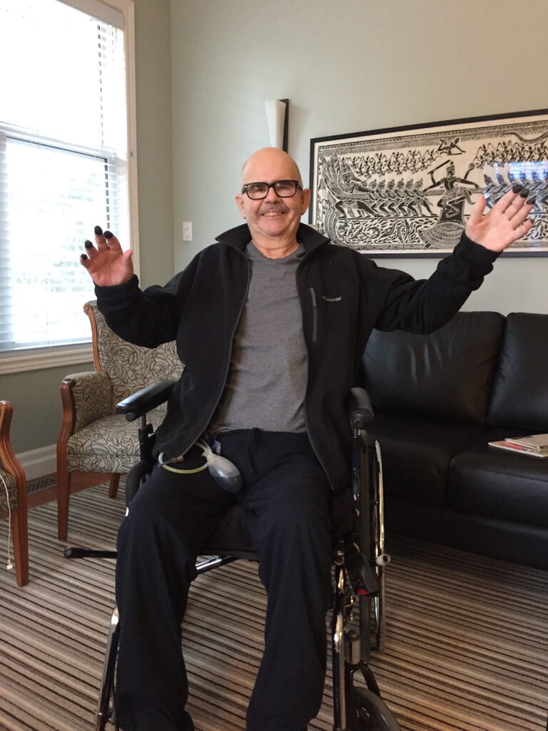 February 17, 2020 – I have begun practicing walking with a tall walker and the support of the physiotherapist and the occupational therapist. My spirits are buoyed by the many wonderful friends who come to visit. Every day I get to be pushed around the hospital in my wheelchair by my visitors. The in-hospital Tim Hortons got a big workout during this period.