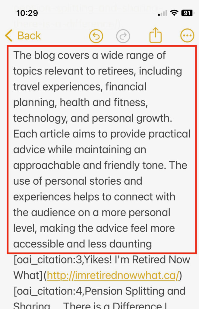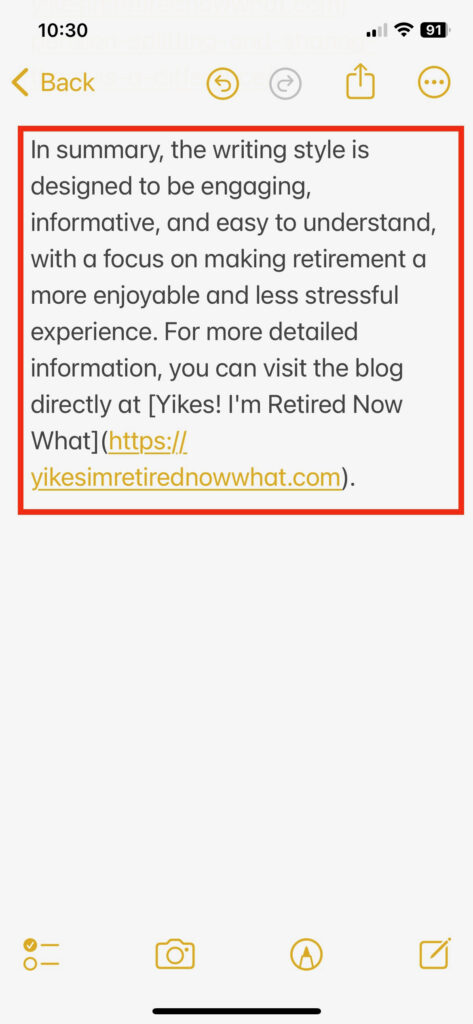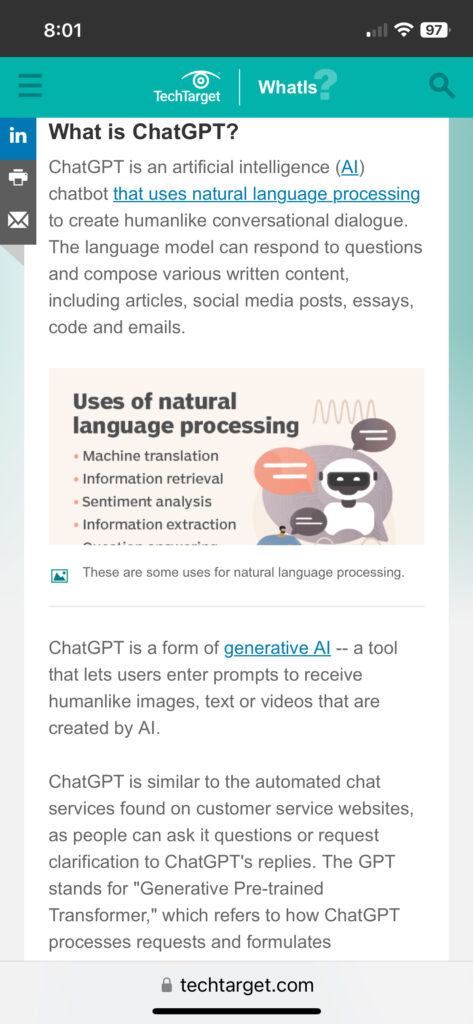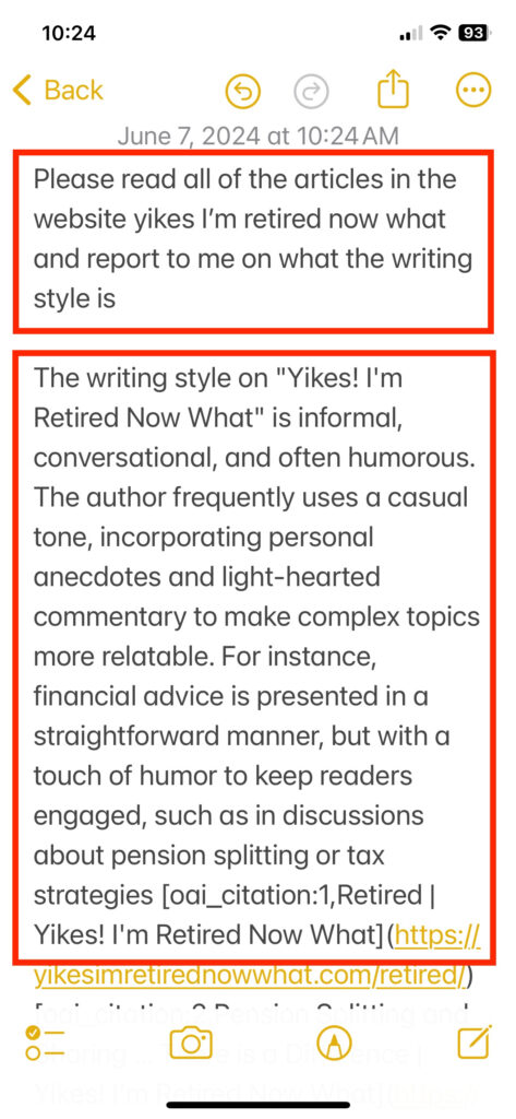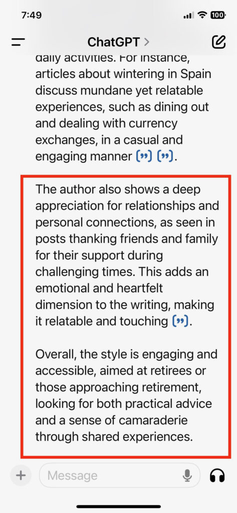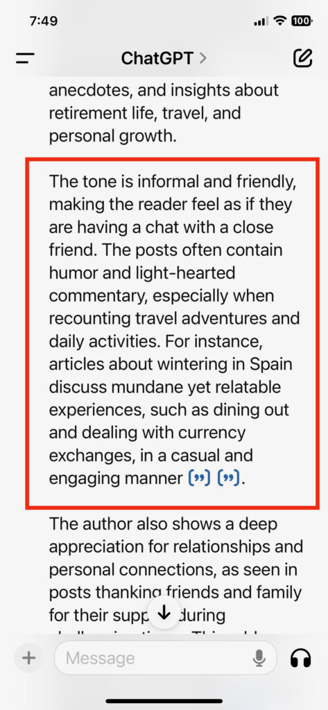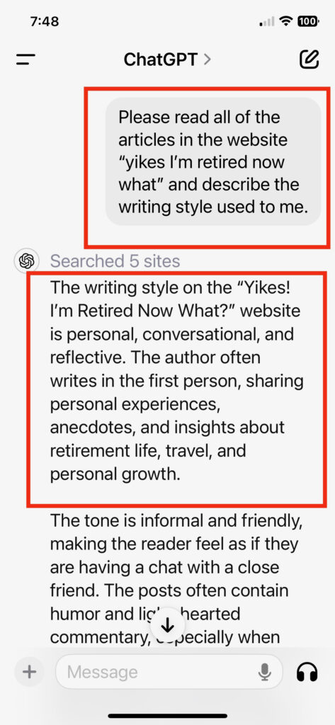 3. My first use of ChatGPT after I downloaded it… I re-asked it to determine the writing style for this website. This image shows my question and the first paragraph of the three-paragraph response.