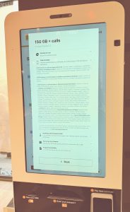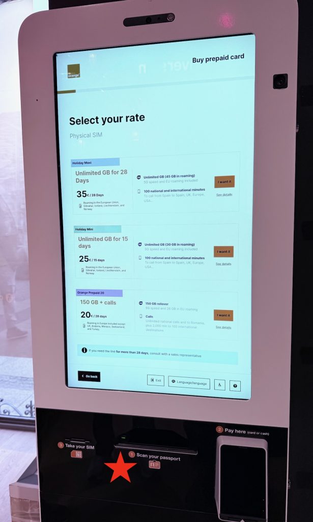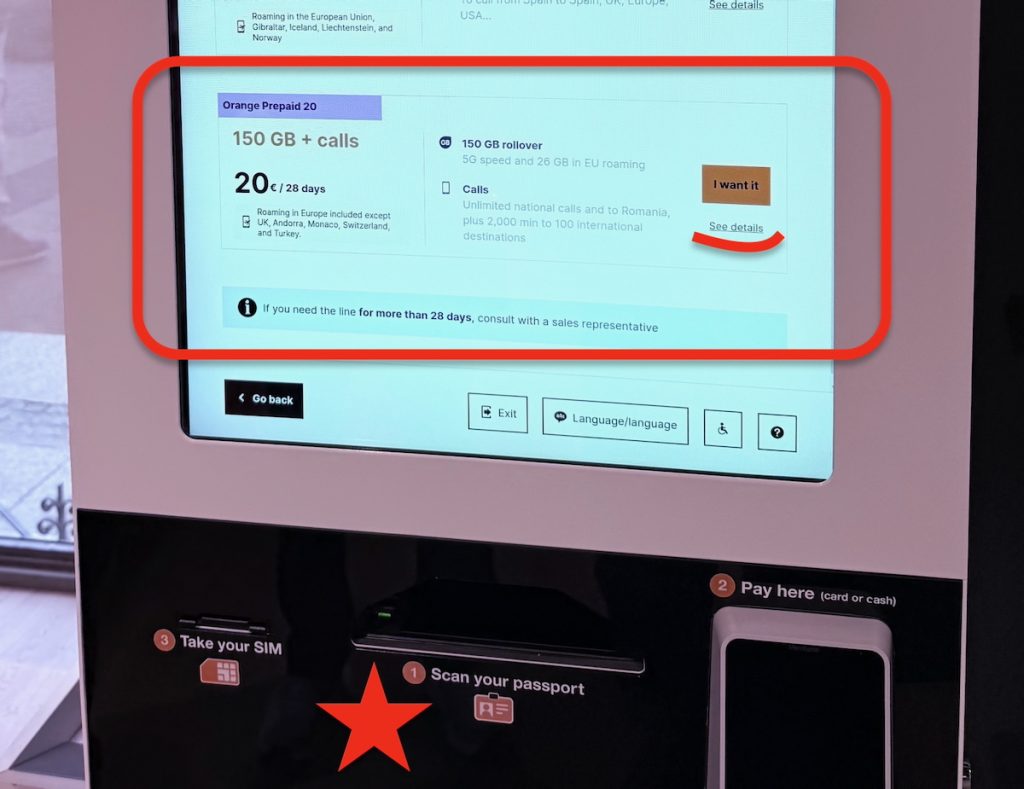 5. At this particular store you can walk in and get yourself a SIM out of this vending machine without any help from the staff and install it yourself. I always get a staff person to do all the work so that when I walk out of the store, I know that I have an operational phone. This image shows some possible plan choices. The red star is beside an opening where you scan your passport to identify who you are. It is important to remember that you must have your passport with you everywhere in Europe when you are getting a phone SIM.
