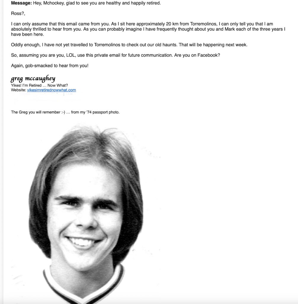 So, why am I going on about this little 50-year-old adventure perhaps when it should be long forgotten? Well, I suppose it may not have been totally forgotten, but it was certainly shelved until something very interesting happened to me in 2019 as we were spending the winter in Fuengirola, Spain. The following email, and my subsequent response, brought those years rushing back into my consciousness in a very visceral and authentic way. Check out this quick little email exchange and then I will share with you a little history about a great period in my life.