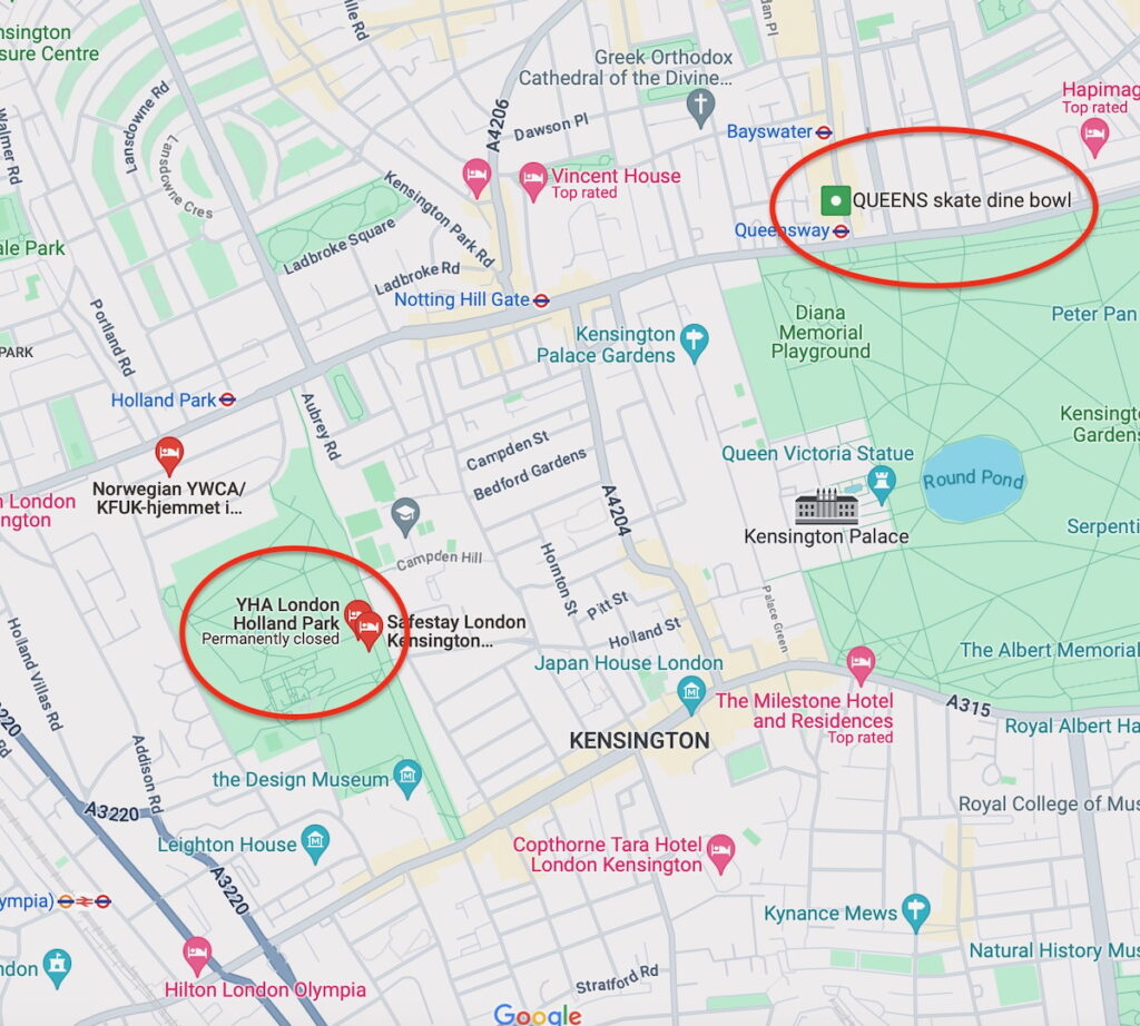 After all those tasks were attended to, I headed off to a youth hostel in Holland Park, the King George VI Memorial Youth Hostel. It is now closed, but as you can see, it remained identified in Google Maps on the day I searched for it. You will also see on the map (circled in red) the location of the “Queen’s skate-dine-bowl” multi-sports facility. I was stunned to find this facility on the map and even more stunned to discover it is still in operation.
