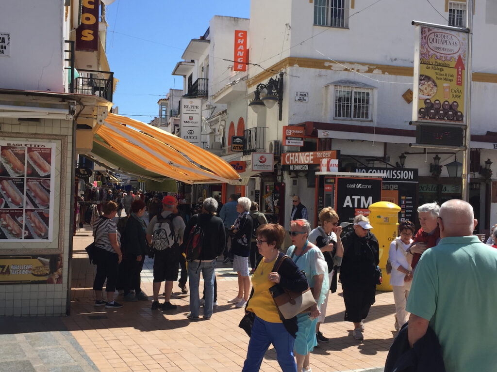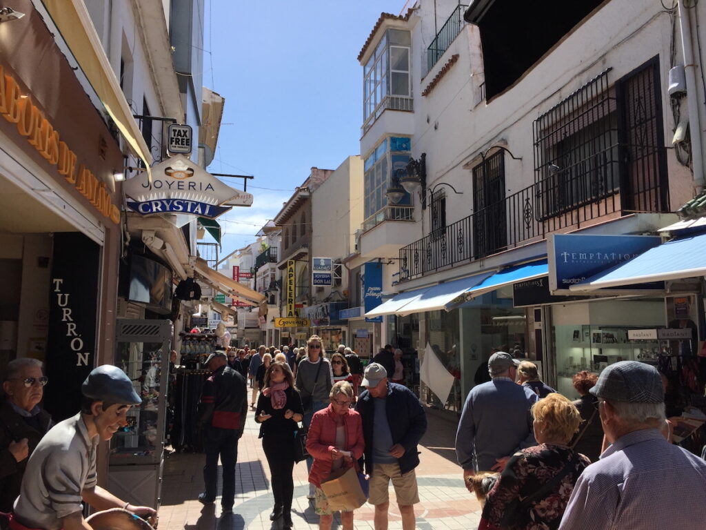 The main pedestrian strip in Torremolinos is Calle San Miguel. Yes, the businesses have changed, but the street remains exactly as I remember it. It is still a busy magnet for locals and tourists… Not too many hippies anymore. 🙂