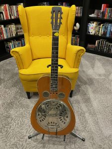 The discovery of this second guitar led to a delightful twist in the story. I had previously decided that I would buy a resonator, or slide guitar, which would be played in an open tuning, resting on my lap. All I would have to do was slide the steel back-and-forth with my wonky left hand and pick away with my right hand… I knew I could do that.