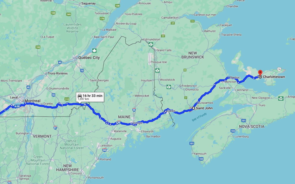 However, when I go down east, I am going much further afield than that. We go to Charlottetown, Prince Edward Island and I’m pretty sure your system is not going to work for destinations like that. I’m confident that going the usual way through Quebec and New Brunswick and slashing cross-country from Fredericton is gonna be much shorter than your proposed route.