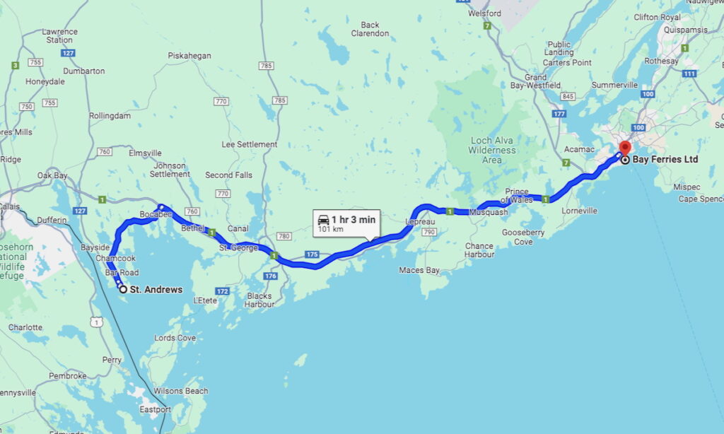Here is the route we took from Saint Andrews to the ferry dock in Saint John.