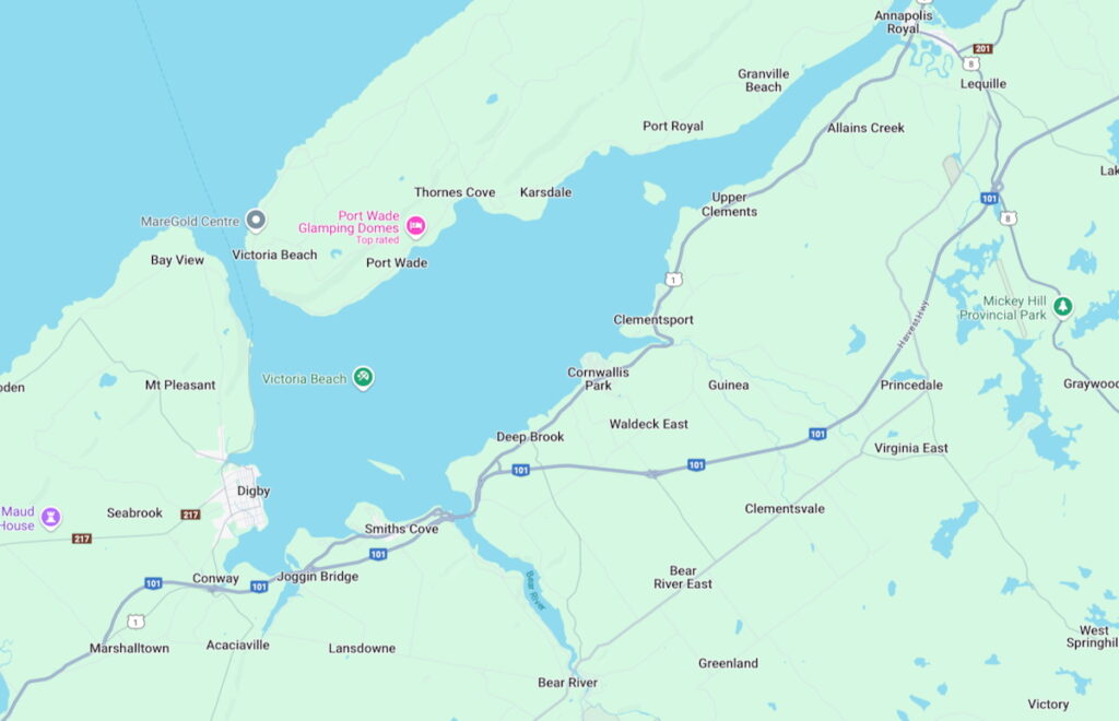Digby is situated in a lovely spot on the Annapolis Basin, as you can see on the map below. Shown in the second image, another of Canada’s great historic inns, the Digby Pines Resort, is located on the edge of town and is a lovely place to stay. It too, has a wonderful golf course. We chose price over quality on this trip… You will notice there are no photos of our accommodation this time. 🙂