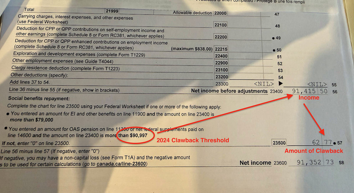 The two images below photos are of Dick and Jane’s income tax returns for income tax year 2024. If you follow the red arrows in the first photo, you track the path from the stated amount for the commencement of OAS claw-back that year, up to their individual net incomes, then follow an arrow down to the amount of money each had clawed back.