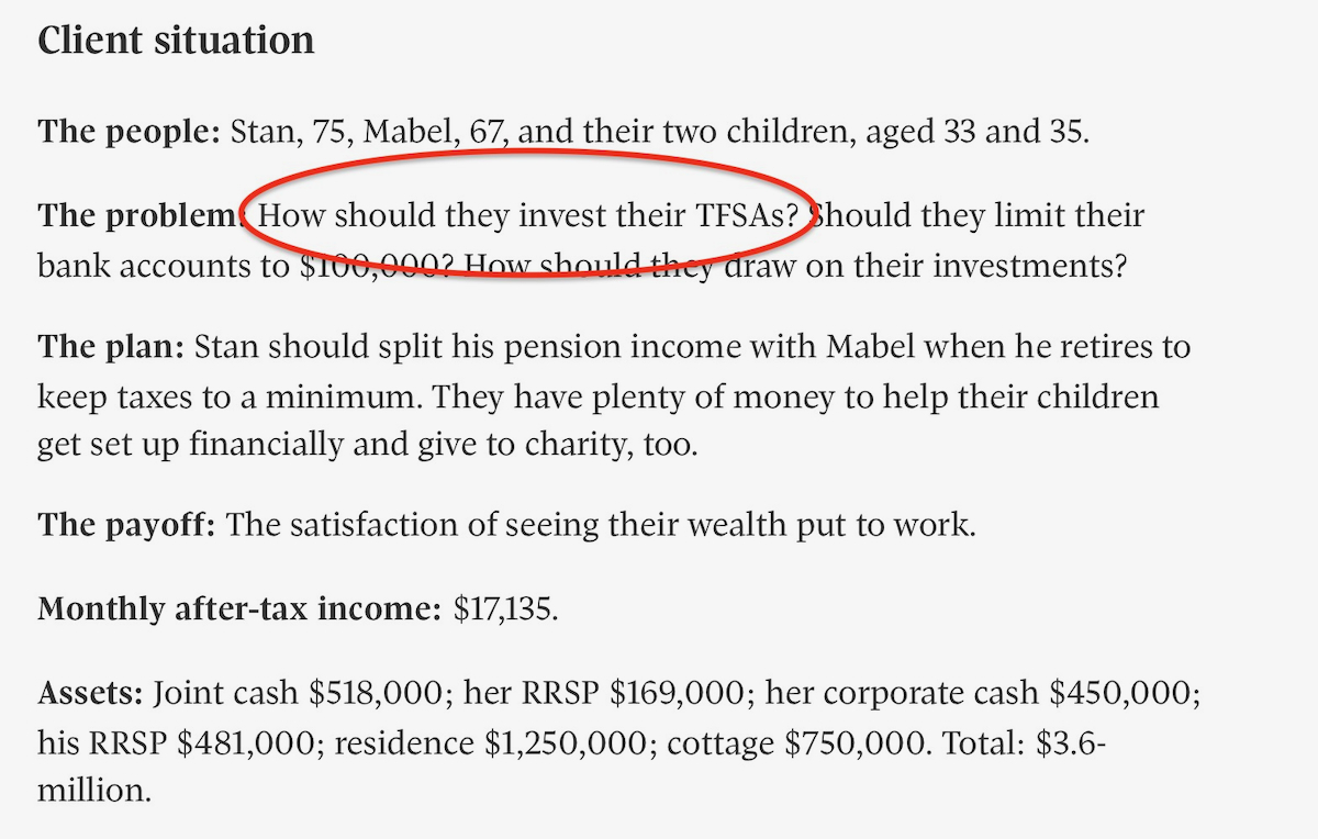 Here are a couple of examples of what I mean. They are from retired individuals who wrote into the Globe and Mail’s FINANCIAL FACELIFT column looking for financial guidance. The photos provide the Globe and Mail’s accounting of their financial assets and situations stated in each article. Follow the links in the names to read the original articles. I was struck by how both of these examples really were not using their TFSAs to their full potential … in one case not at all. And these are affluent folks.