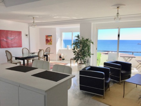 The unit was advertised as a two-bedroom place; before we arrived, it was converted back to the original three-bedroom floor plan. This puts the kitchen nicely in the living area. It looked great in the online photos and looks even better in real life, and it sits right on the beach. We arranged it through a Spain-only AirBnB equivalent.