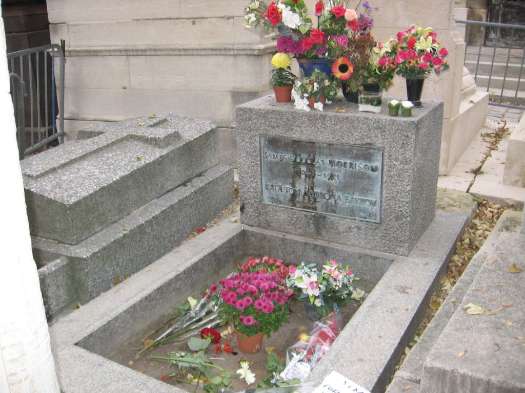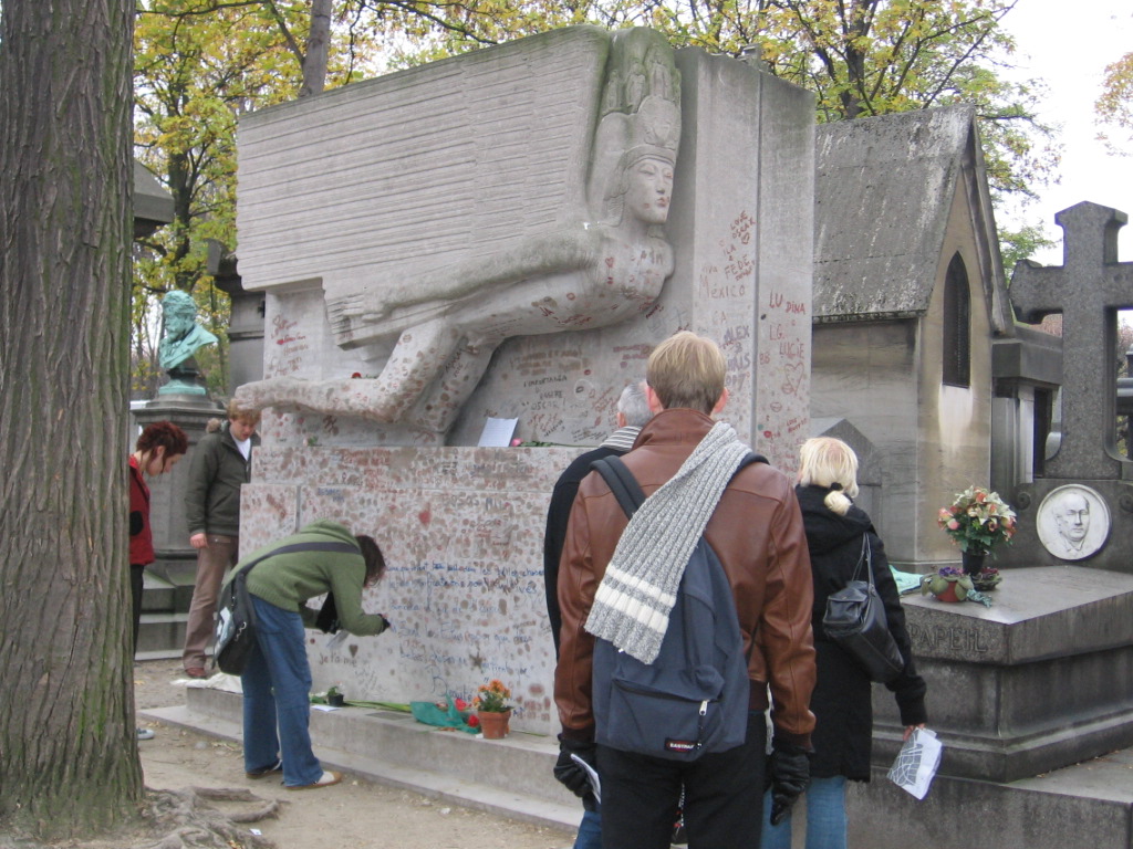 So here it is, Père Lachaise’s most famous grave, Jim Morrison’s. Paris is where he “broke on through to the other side”… hence, he was buried there. When we arrived, an attendant was removing a bottle of whiskey from the top of his tombstone. If you look closely you can see one of the several “joints” that had been left by admirers.