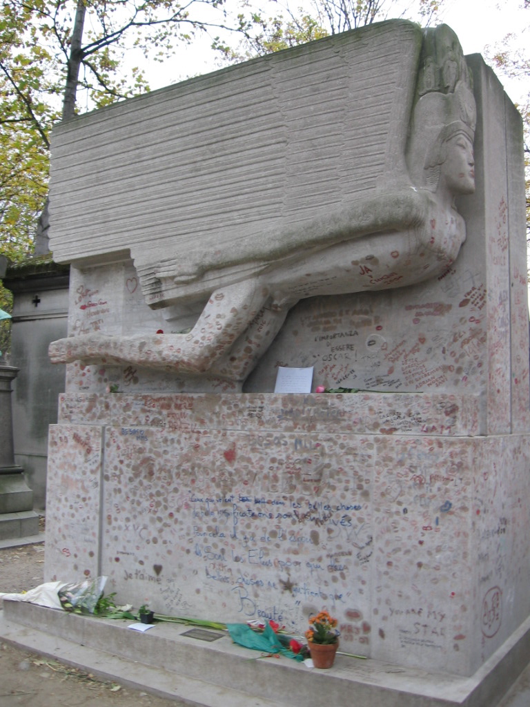 I once heard that this was the most desecrated tomb in all of France. The grave of Oscar Wilde. For some reason, kissing the tomb with bright red lipstick became a phenomenon. Someone even went to the trouble to chisel off the penis from the sphinxlike figure. For the record, Jewish graves are the ones that are most frequently desecrated in France. Will this anti-Semitic madness never end?