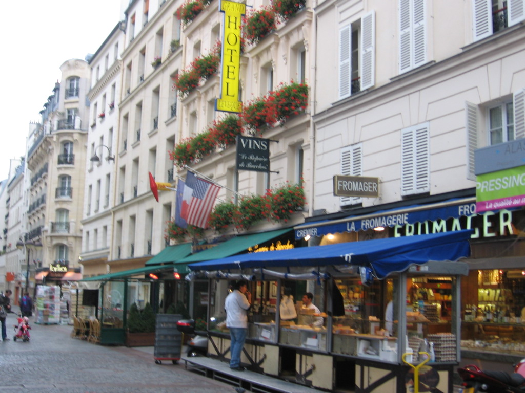 The building with the rows of flower boxes in the windows is a hotel right on Rue Cler that Rick Steves recommends, the Grand Hôtel Lévêque. It would be a great place to stay. I think it was fully booked when we ended up at the Hotel Prince.