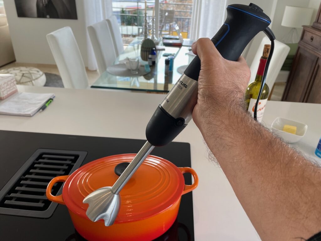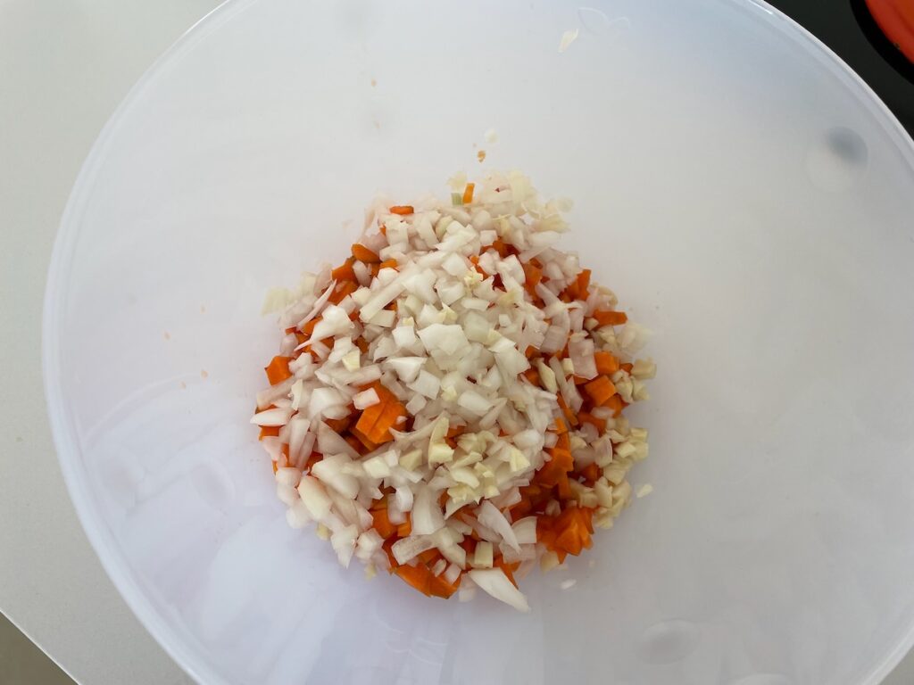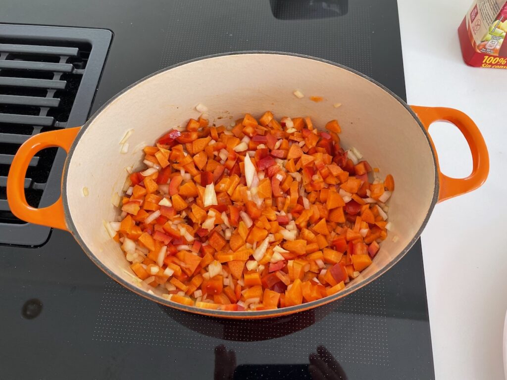 The vegetables are cut up very small as you can see because they will be puréed at the end of the cooking process.