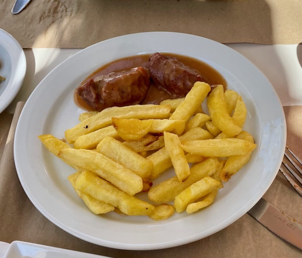 I am a relentless photo taker, as you may have figured out. I went back through my photos in search of one of my Carrilladas meals and ultimately found one that I could use… This one. Not the most elegant presentation but this is often how it will be served if you ask for a “Media Racione” or “Half Ration” – The Carrilladas, along with some proper English-style chips.
