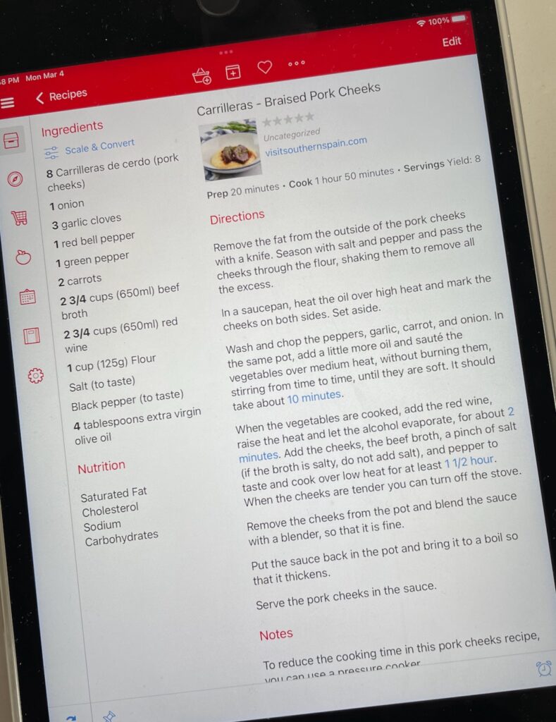 And once again this year when we went out to eat, it was amongst the first dishes that I ordered. And then a little serendipity got involved. While we were out grocery shopping at our local “Mercadona Supermercado” I was checking out the frozen lamb and beside it in the cooler were the pork cheeks that are used in this dish. I grabbed some and searched for a recipe as soon as I got home.