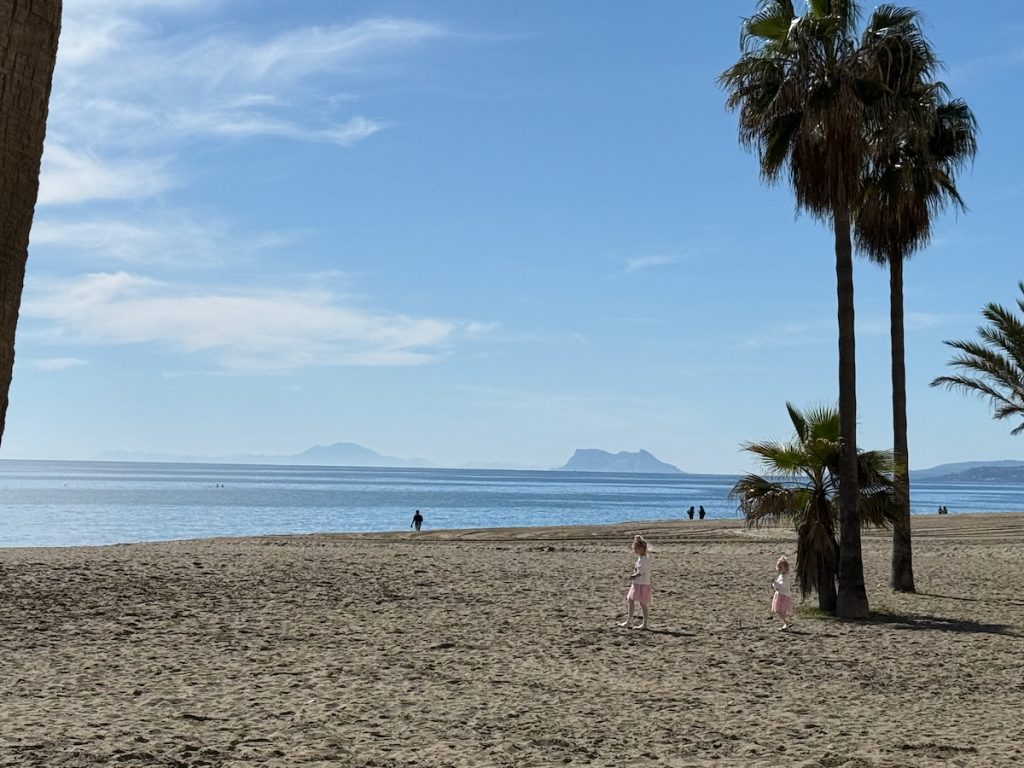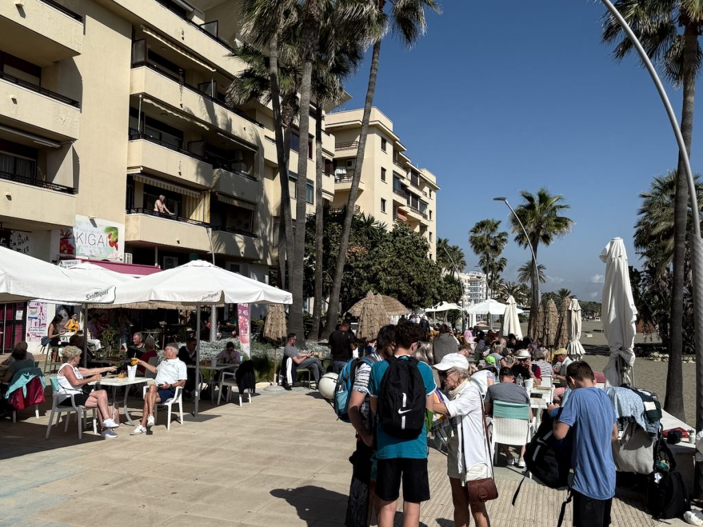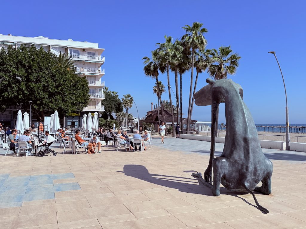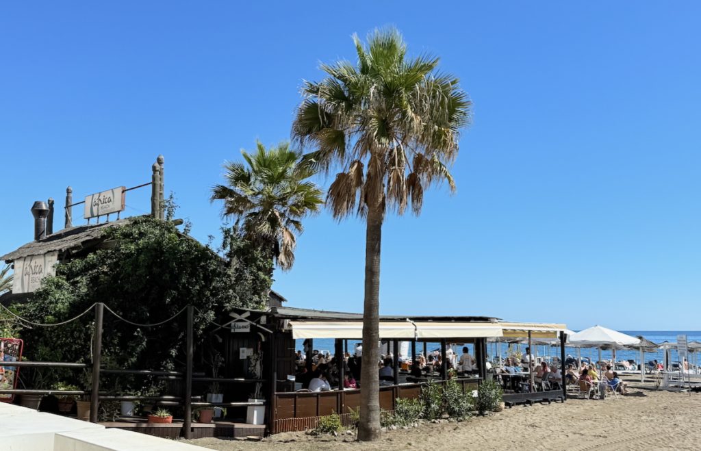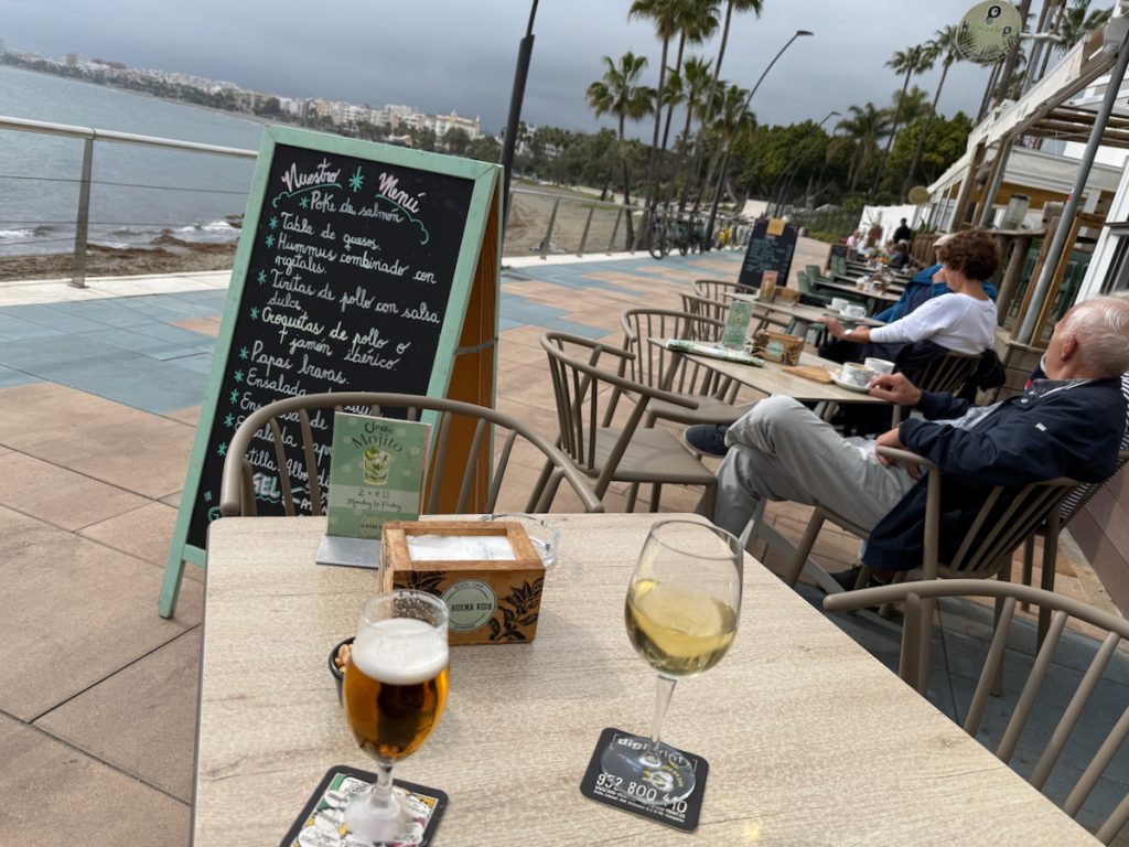 29. Heaven! Even on a cloudy day! For the record, the beer cost €2.00 and the glass of wine cost €3.00. €5.00 is the equivalent of $7.50 in Canadian dollars. And even on this cloudy day, the Love-goddess took off her jacket when we sat down for drinks because she was plenty warm. Even a bad day on the Costa del Sol ain’t a bad day.