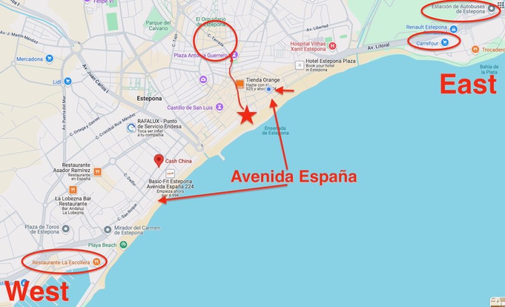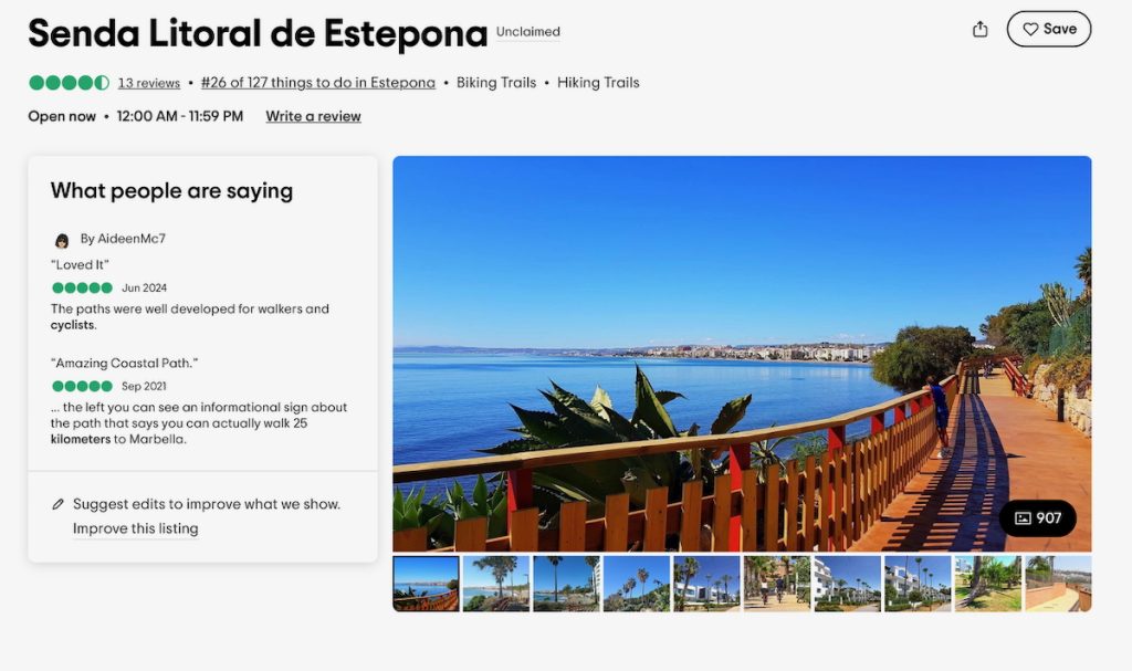 23. I later discovered that this wooden boardwalk is the beginning of a very long trail that you can walk or bike on for many kilometres east along the waterfront towards Marbella. It is called the “Senda Litoral” (Costal Path) … shown here in a screenshot from Tripadvisor. You can read about it here on the official Estepona tourism site.